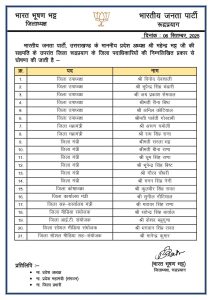 घोषित सूची में सभी नवनियुक्त पदाधिकारियों को जिम्मेदारियां सौंपते हुए पार्टी ने आगामी समय में संगठन और जनता के बीच मजबूत सेतु बनने का आह्वान किया है। इस अवसर पर पार्टी कार्यकर्ताओं और समर्थकों में हर्ष और उत्साह का माहौल देखने को मिला।